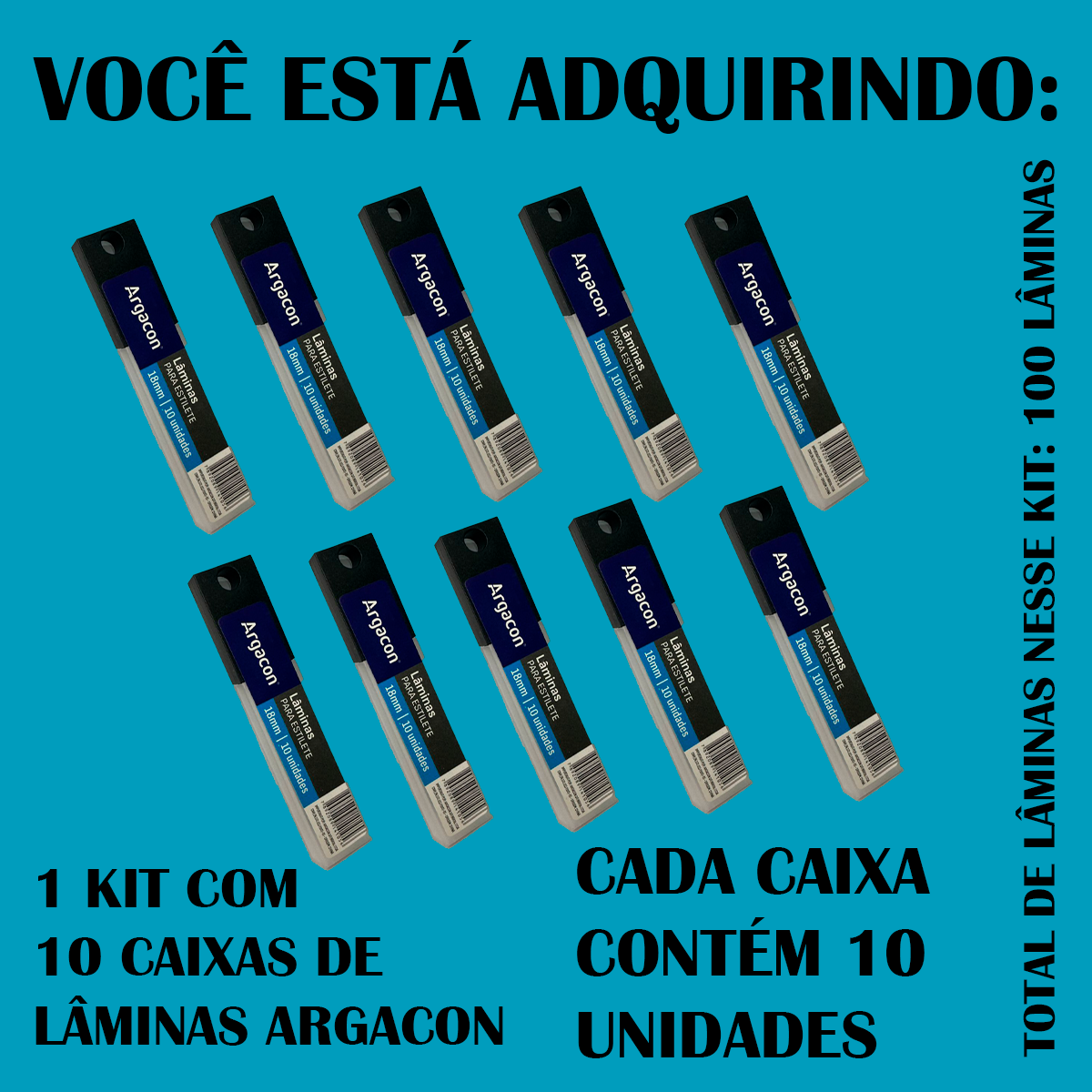 Kit com 10 caixas de lâminas Argacon de 18mm, totalizando 100 lâminas segmentadas em aço de alta durabilidade, ideais para reposição de estiletes e uso profissional.
