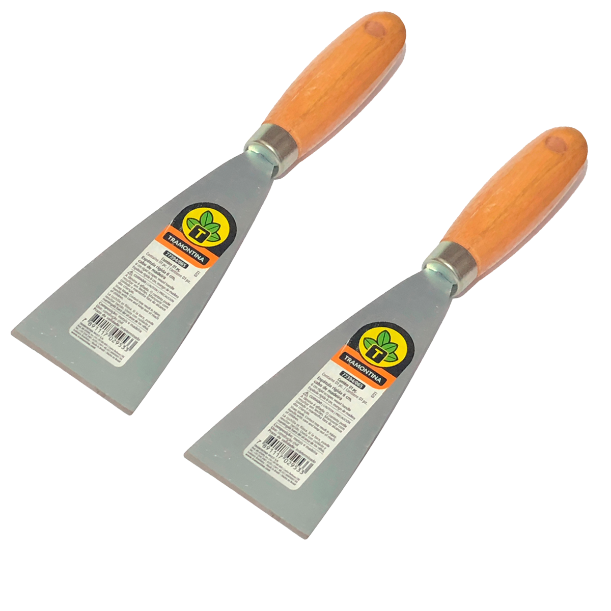 Kit com 2 espátulas rígidas Tramontina com cabo de madeira e lâmina metálica afiada. Ferramentas resistentes e práticas, ideais para raspar, aplicar massa e remover resíduos com eficiência e conforto no manuseio.