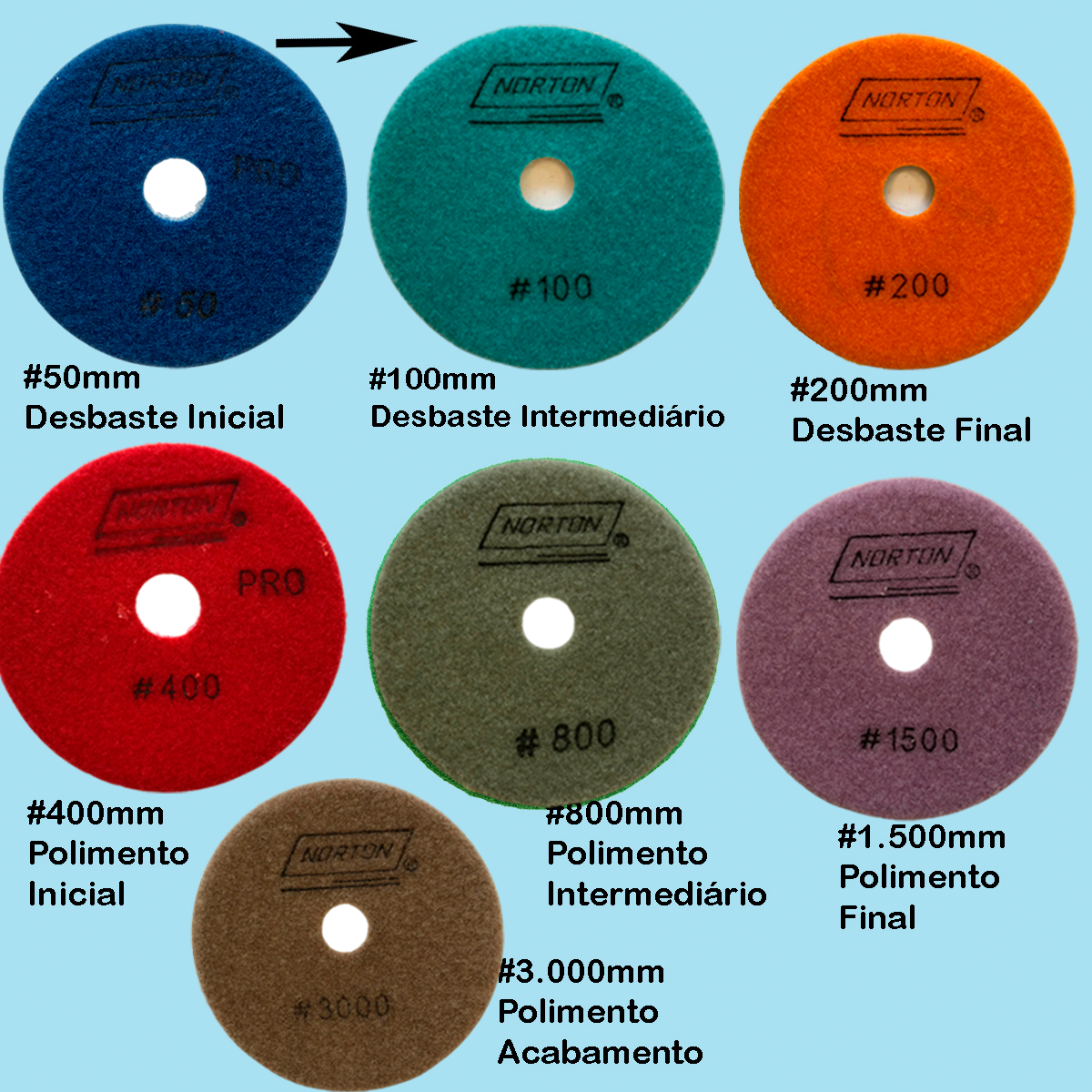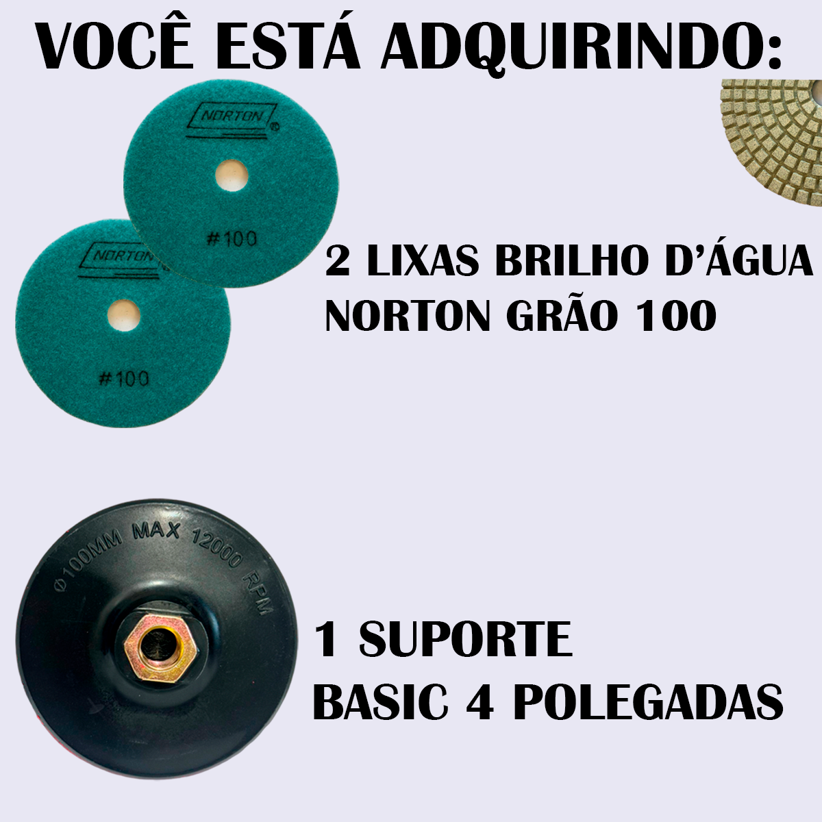 Kit com 2 Lixas Norton Brilho D’Água Diamantadas grãos 50 e 100 + suporte, ideal para polimento úmido em porcelanato, mármore e granito. Alta durabilidade e acabamento uniforme.