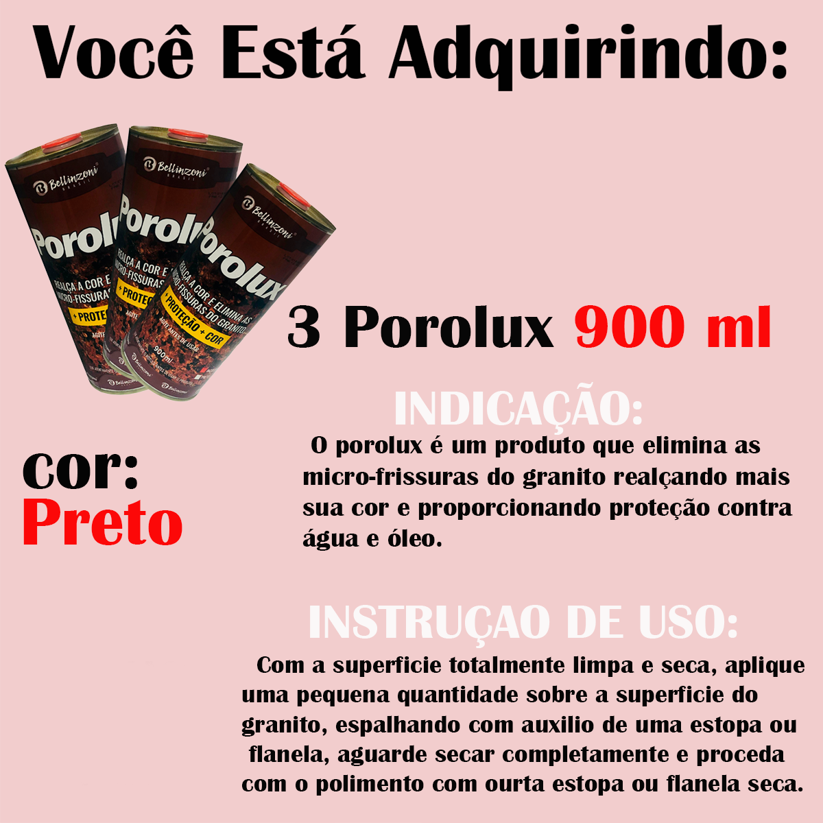 O Kit com 3 Porolux Preto 900 ml foi desenvolvido para quem busca cobertura ampla, manutenção contínua e resultado profissional em superfícies de granito escuro. Este restaurador de alto desempenho penetra profundamente no material, eliminando microfissuras, revitalizando a cor preta natural da pedra e oferecendo um brilho duradouro sem alterar a textura original.
