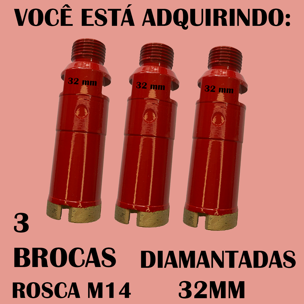 Kit com 3 brocas diamantadas de 32mm. Indicadas para porcelanato, granito e mármore. Alta durabilidade e precisão, mantendo o padrão de qualidade mesmo com variações no modelo.
