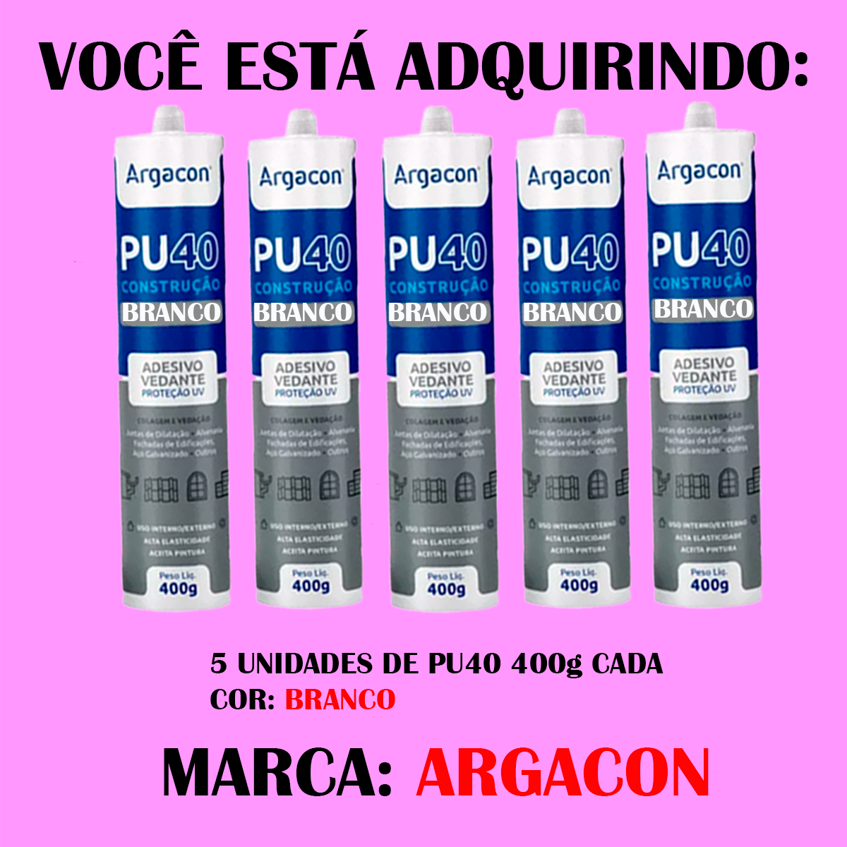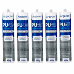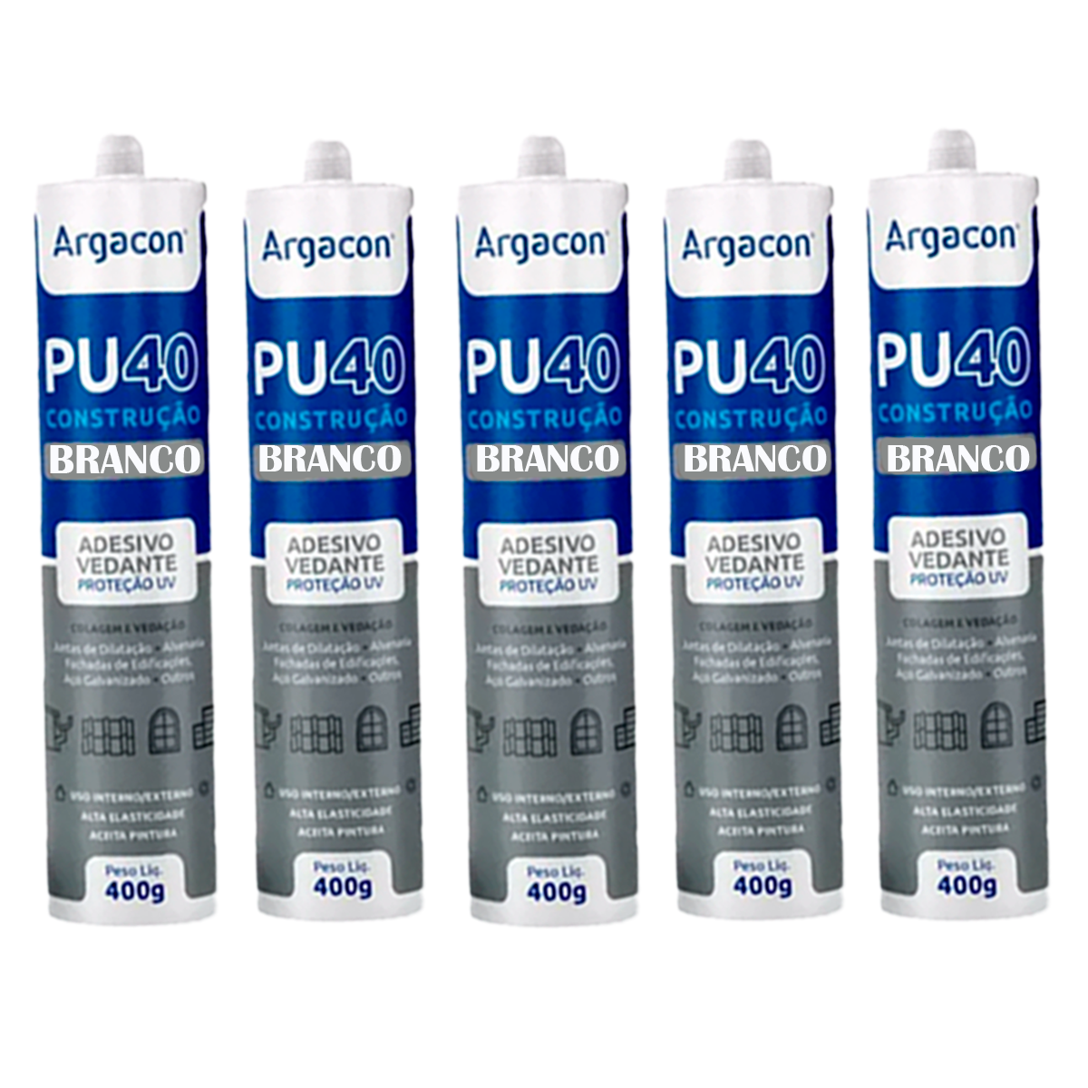 Kit com 5 unidades de PU40 Branco Argacon (400g cada). Vedante de poliuretano com alta elasticidade, resistência à água e proteção UV. Indicado para colagens e vedações em mármore, granito, cerâmica, concreto e porcelanato. Pode ser pintado após a cura.