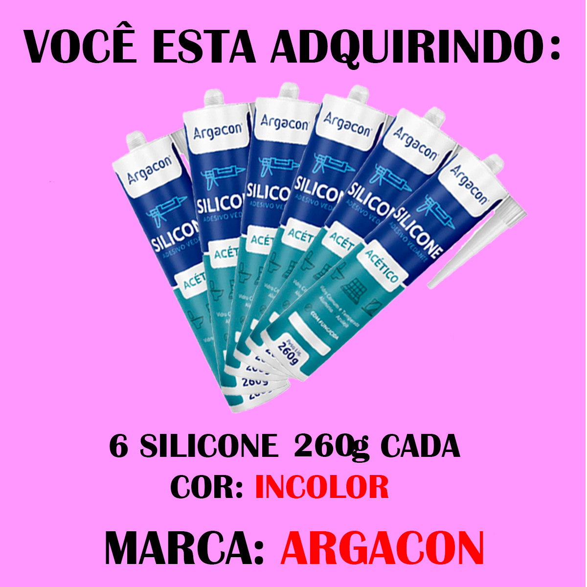O Kit com 6 Silicones Acéticos Incolores Argacon 260g é a escolha ideal para quem busca eficiência, economia e qualidade profissional na vedação e colagem de superfícies. Produzido com formulação à base de silicone acético, o produto oferece alta aderência, excelente flexibilidade e resistência, garantindo vedação firme e duradoura em diversas aplicações.