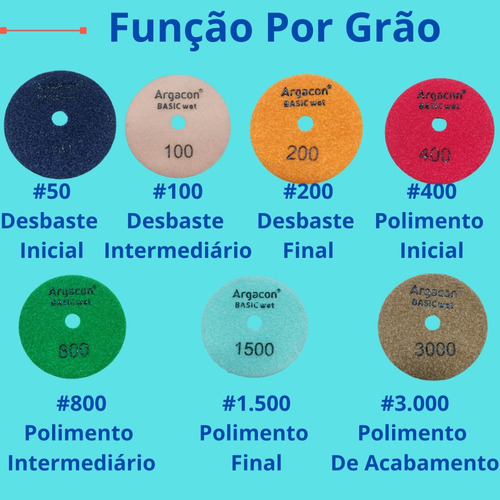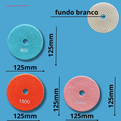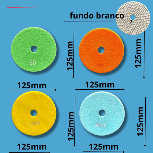 Kit com 7 Lixas Diamantadas Alto Brilho 125mm, ideais para polimento úmido de porcelanatos, mármores e granitos. Grãos variados que garantem brilho intenso e acabamento profissional em todas as etapas do processo.