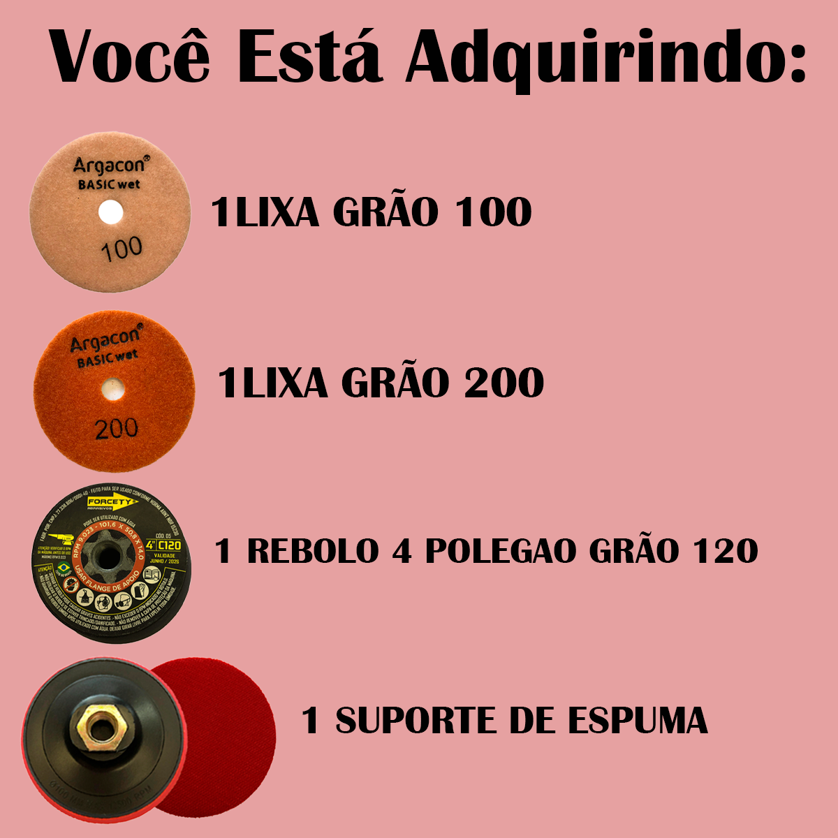 Kit completo para acabamento em porcelanato, mármore e granito. Contém 2 Lixas Brilho D’Água Argacon (grãos 100 e 200), 1 Rebolo Forcety 4” grão 120 e 1 Suporte com velcro. Ideal para polimento úmido com ótimo desempenho e acabamento uniforme.