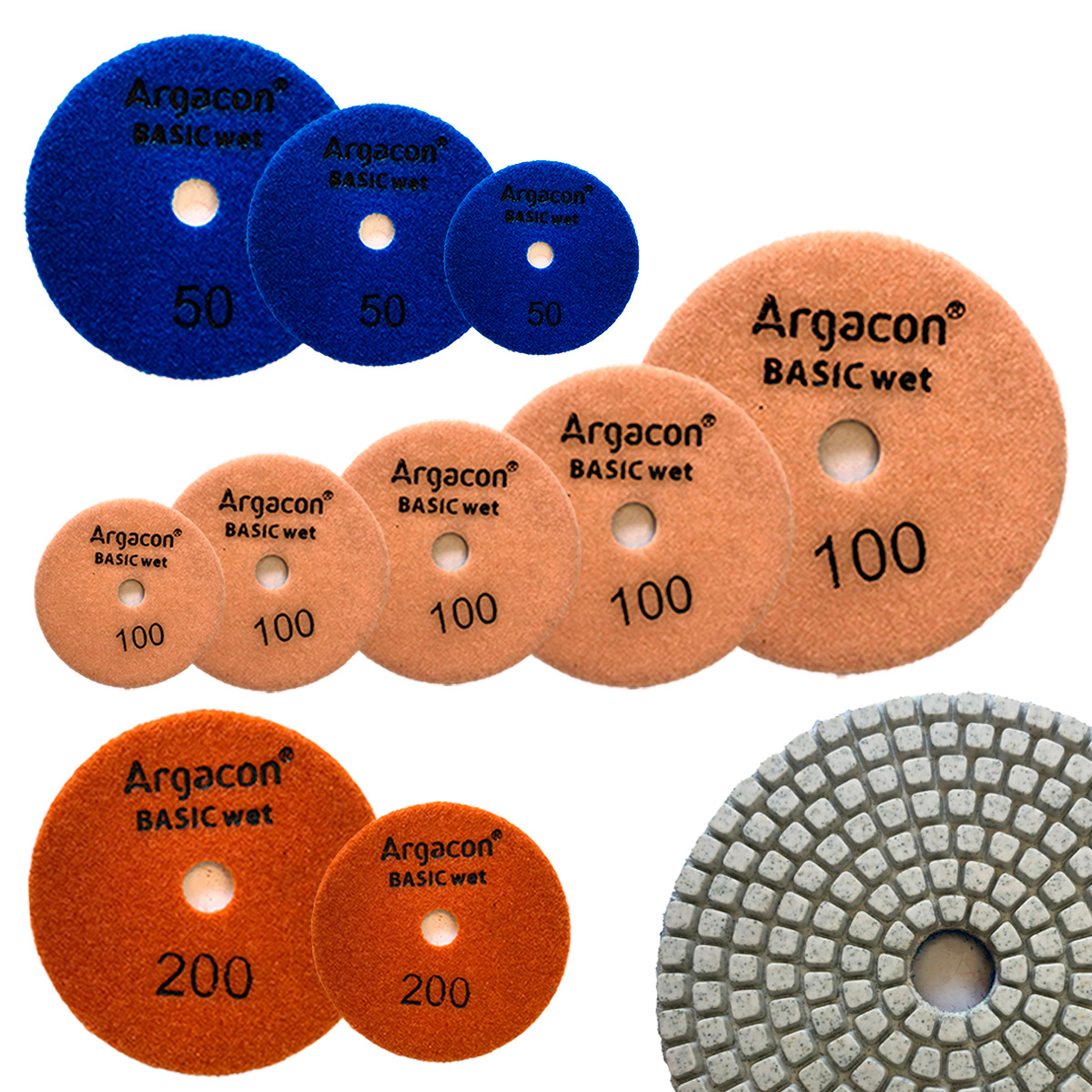 Kit completo para acabamento e polimento de porcelanatos, mármores e granitos. Contém 10 Lixas Diamantadas Argacon (3 grão 50, 5 grão 100 e 2 grão 200). Ideal para desbaste, nivelamento e polimento úmido com alto rendimento.